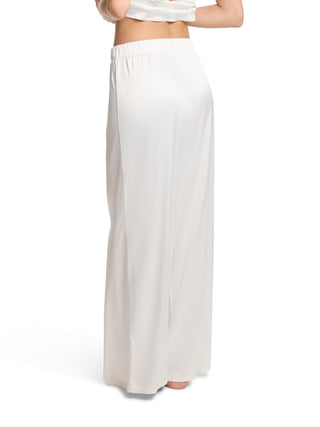 Woman wearing a white sleeveless top with blue accents and white pants on a white background