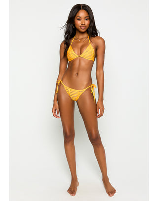 Model wearing the 'Hard Summer Tie Side Bottom - Sunshine' bikini, featuring a bold yellow hue with edgy horizontal strap cutouts and adjustable side ties. Paired with a matching triangle top, she poses confidently against a white studio backdrop.