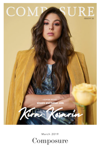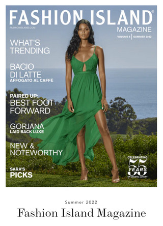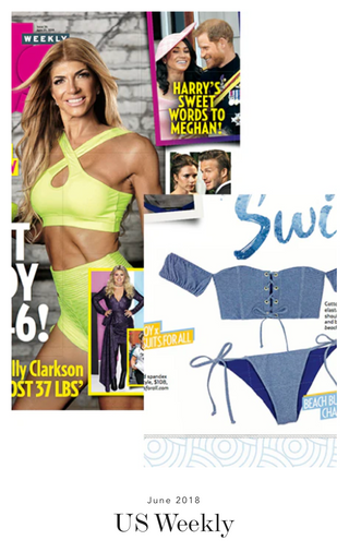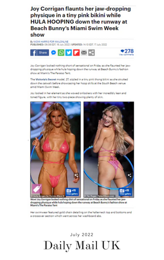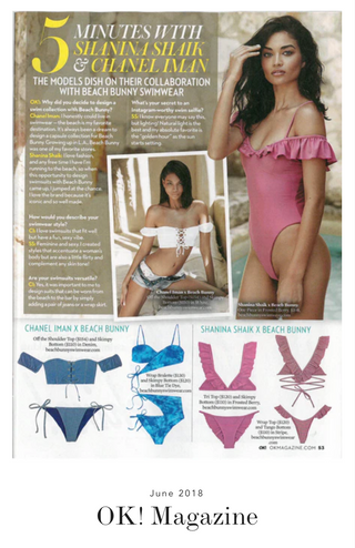 Model wearing an orange bikini with gold chain detail and triangle top, styled with layered beaded necklaces and wet beach hair, posing against a turquoise ocean backdrop. Trendy summer swimwear with luxe accessories.