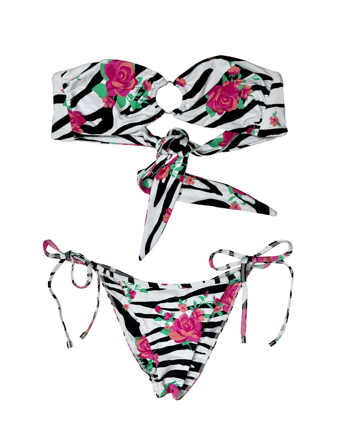 The Bethany Bandeau is a chic and eye-catching piece, featuring a gold hammered ring detail at the front that adds a touch of natural elegance. We have added a shell and starfish charm at the ring. The bandeau ties at the back, allowing for an adjustable and comfortable fit. The fabric showcases a vibrant rose print over a zebra print. This combination of striking design and luxurious detailing makes the Bethany Bandeau a perfect addition to any wardrobe, offering both style and sophistication with a tropical flair. Pairs with Alex Micro Tango and Constance Tie Side Skimpy Bottom in Zebra Rose.