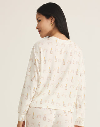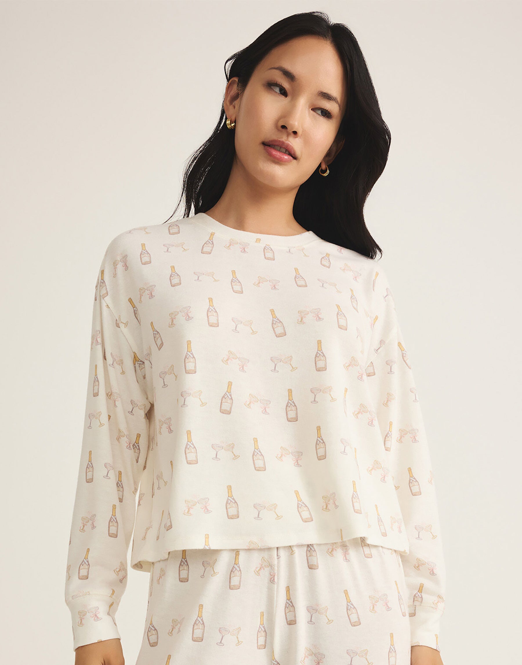 Our favorite beverage is now an adorable print. The Champs Long Sleeve Top is made using new, silky smooth fabric, and features a scoop neckline and oversized fit. It makes a matching novelty set with the Dawn Champs Pant.