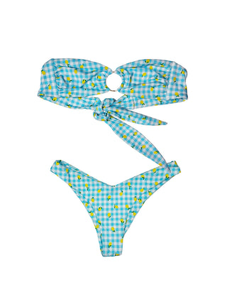 Meet your new summer obsession—the Limoncello Spritz Bandeau Top by Beach Bunny Swimwear. This flirty strapless bikini top features a playful blue gingham print sprinkled with yellow lemon embroidery, bringing all the fresh, sunny vibes. The chic center front ring detail with a dangling lemon charm adds that signature Beach Bunny glam, while the adjustable tie-back ensures a perfect, stay-put fit. Ideal for tanning, resort lounging, or turning heads at your next pool party, this bandeau bikini top pairs perfectly with any of the Limoncello Spritz bottoms for a standout summer set.