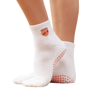 The 'Peachy' grip socks are a vibrant and playful addition to your Lagree, Pilates, Yoga, or Barre gear. These socks bring a burst of energy and style to your workout routine. They provide not only a fun aesthetic but also the essential grip and comfort needed for your fitness activities.