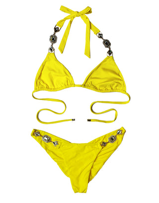 The Raja Skimpy Bottom in sunshine yellow bikini bottom features dazzling crystal-embellished hardware at the hips, adding a touch of luxury to its minimal, flattering cut. The skimpy fit offers just the right amount of coverage to show off your curves and elevate your swimwear game. Pair it with the matching Raja Triangle Top or mix and match for a custom beach look that turns heads from Miami to Mykonos.